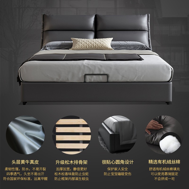 1.頭層黃牛真皮:柔韌性強,防水,不易開裂,四季透氣,久坐不易出汗。 2.穩固耐用無聲響:金屬鋼框和樺木板條,結實而牢固,承重力強。 3.貼心圓角設計:保護家人安全,防止寶寶磕碰受傷。 4.貼合腰身,精細裁剪:做工精細,造型圓弧有度,精湛的車線,細節無處不在。